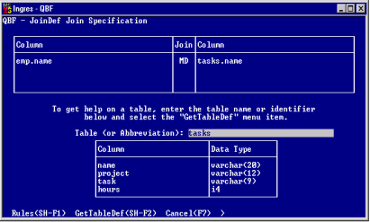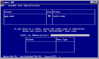 For example, in a JoinDef containing the tables Staff and Tasks, QBF selects the column called Name in each table as the join column. If there are no common columns with the same name, the JoinDef Join Specification frame is displayed empty, and you must enter the join columns you wish to use.