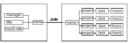If the EMP table (master) were joined to the Tasks table (detail) through the Name column in each, you could access information such as the tasks, projects, and hours (from the Tasks table) of employees who work for a certain manager (from the Staff table).