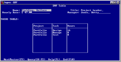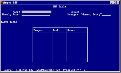 Thus, the many entries in the Task column of the Tasks table are accessible through the one entry in the Manager column of the Staff table. The following figure shows Jones, Betty, in the Manager field of a form for the EMP table.