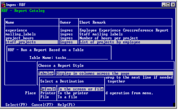 1. Go to the Report Catalog frame and position the cursor on the name of the report specification that you want to run. RBF displays the Select a Destination pop-up.
