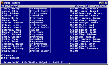 The rest of the output window contains the data and messages returned by the request. You can scroll the rows of output up and down or left and right in the output window, using your mouse or the keys mapped to the scrolling functions. To go directly to the end of the output, use the key mapped to the Bottom FRS key operation; to go to the top of the output, use the key mapped to the Top FRS key operation.