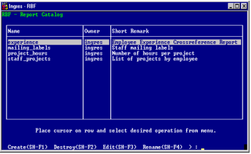 The Report Catalog frame, shown in the following figure, provides access to all the basic RBF functions. The table field portion of this frame lists all the report specifications for this database owned by you or the database administrator. Report specifications owned by other users are not listed in the Report Catalog frame.