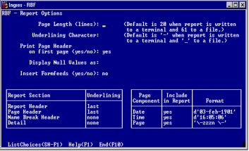 The Report Options frame allows you to specify output options that apply to the report as a whole. With the Report Options frame you can specify: