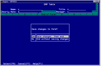 If you try to end or quit without saving a new or changed form, VIFRED displays a pop-up form like the one shown in the following figure.