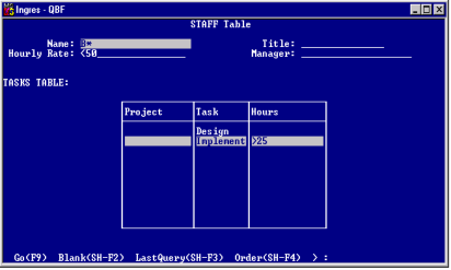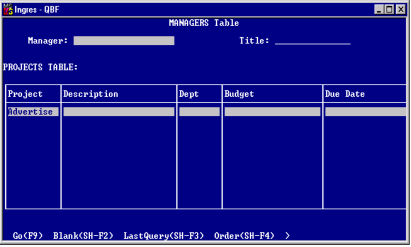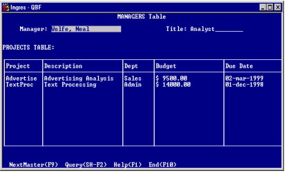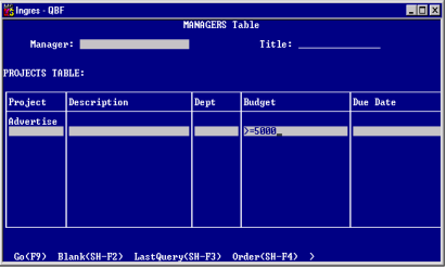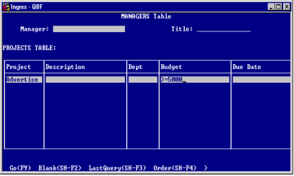 In the following figure, for example, QBF only retrieves data from the Project and Managers tables that have the Project ID Advertise AND a Budget of more than $5,000.