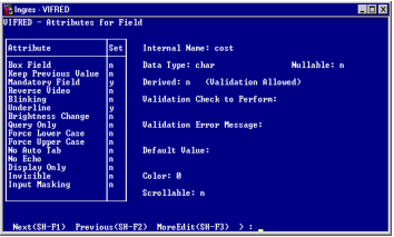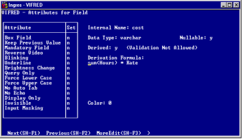 1. On the Attributes for Field form, tab to the Derived field and type y (yes).