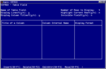 When you have created the columns for your Table Field, use the Insert, Delete, EditAttr, and Move operations on the Table Field frame to edit them, as you want. For more information, see the discussions following this procedure.