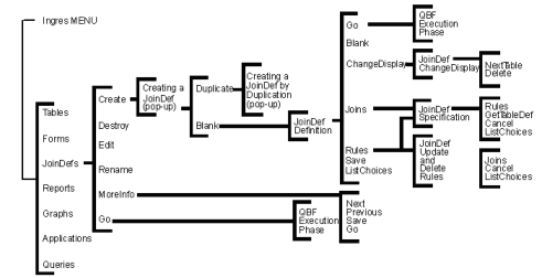 The map in the following figure illustrates the route QBF takes when you choose JoinDefs from Ingres Menu or from the QBF menu: