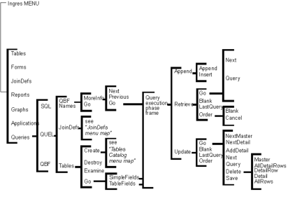 You can access QBF frames from the QBF Startup frame. For a map of the options available to you when you choose the JoinDefs operation, see the chapter “Using JoinDefs in QBF.”