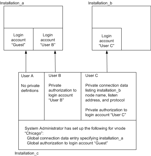 On installation_c, the system administrator has created a vnode (“Chicago”) with a global connection data entry specifying installation_a and a global remote user authorization specifying a login account (“Guest”) on that instance. User A has not defined any private definitions for vnode “Chicago” that takes precedence over the global definitions.