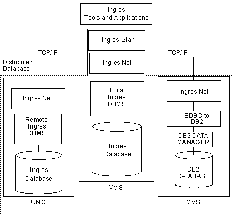 Ingres applications on VMS are linked by Ingres Net to the remote DBMS Server on UNIX with the TCP/IP network protocol. Ingres applications on VMS are linked by Ingres Net to the remote EDBC to DB2 on MVS with the TCP/IP network protocol.