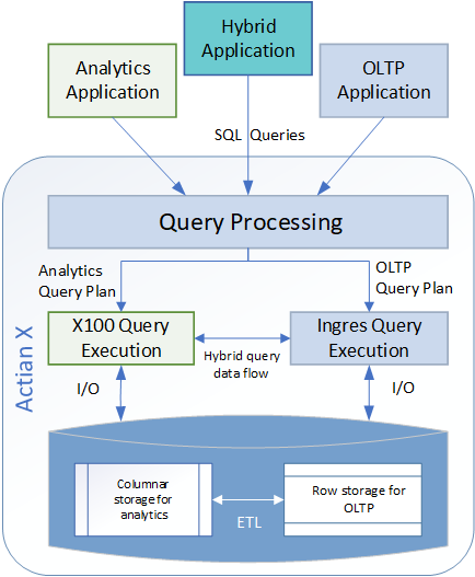 Actian Ingres is a hybrid online transaction processing and analytics processing database solution. Actian Ingres lets you create (traditional) Ingres tables (with BTREE, HEAP, HASH, or ISAM storage structure) and X100 tables (with X100 or X100_ROW storage structure).