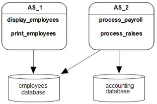 To minimize the overhead required to make connections on behalf of global transactions, you should group transactions that require access to the same databases into application servers. For example, if the “display_employees” and “print_employees” services require access to the “employees” database, and the “process_payroll” and “process_raises” services require access to both the “employees” database and the “accounting” database, design your application servers as shown in the following diagram:
