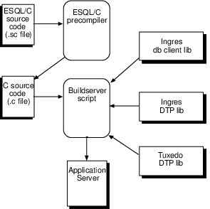 For an application server (AS) to work correctly in conjunction with an Ingres database, the AS must be built with the Ingres DTP client libraries. The following diagram shows the steps involved in building an application server.