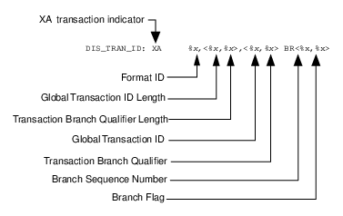 The following figure explains the format of logstat output for XA global transactions. In this diagram, “%x” denotes a 4-byte hexadecimal number.