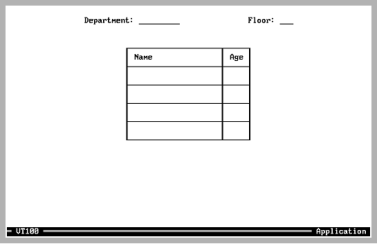 The examples in the remainder of this chapter all use the same form and database tables. The empform form, shown in the following figure, has one table field, employee, and two simple fields, department and floor. The table field has four displayed rows and two displayed columns, with the internal names of ename and age. The titles of the columns are Name and Age.