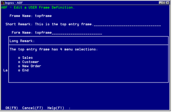 1. From the Edit a USER Frame Definition menu, choose LongRemark. The LongRemark pop-up frame appears.
