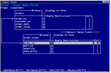ViewOrders is a Browse frame that lets users display existing customer orders. The following figure shows the visual query for this frame: