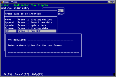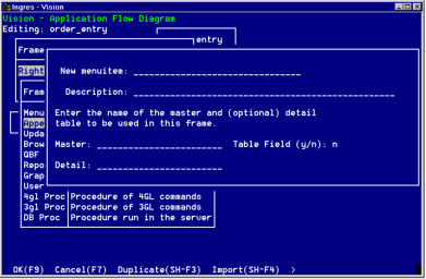 Vision displays a pop-up window in which you enter basic information about the frame. The following figure illustrates this window for Append, Browse, and Update frames: