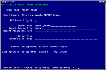 In creating a report frame, you enter the Ingres Reports interface. To learn more about this interface, see the Using Character-based Querying and Reporting Tools.