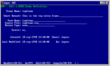 A unique feature of a user-specified frame is that you can create a 4GL source code file which provides the menu and operations for the frame. In other Ingres tools, such as RBF, the frame uses the default menu for the interface.