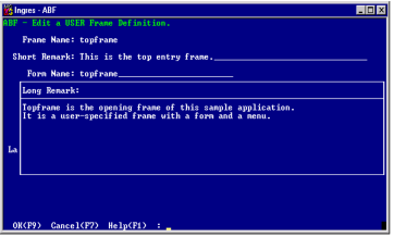 5. Choose OK. ABF creates the frame and displays the Edit a USER Frame definition frame, as shown in the example.