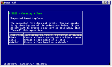 Because this form does not yet exist, the VIFRED Creating a Form frame appears, as shown below. The frame menu lists four default forms: Duplicate, Blank, Table, and JoinDef.