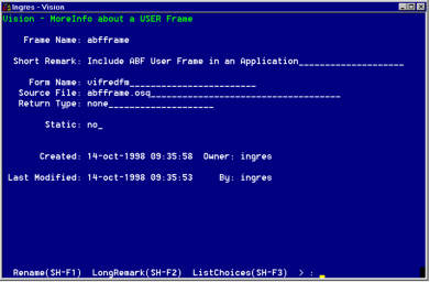 2. Select MoreInfo to display the MoreInfo About a User Frame window, as shown in the following figure. The window displays the frame name and description you just entered, as well as when and by whom the frame was created.