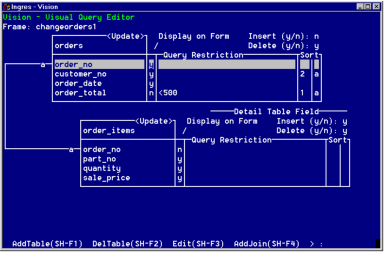On the visual query window, adding new records is controlled by a simple field labeled "Insert (y/n)" for the Master table and a similar field for the Detail table. By default, Vision lets users add new records to the Detail table but not to the Master table.