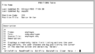 The position_code, position_title, last_updated_at, and last_updated_by fields are read-only fields passed to the form from the Positions frame. The position_description field is a table field "tbl" containing the contents of the position_description field. The changes made to this field are passed back to the Positions Frame. However, this does not change the field in the database. From the Positions Frame, you can select Save to update the field in the database.