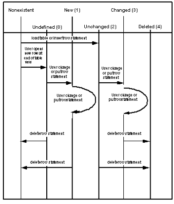 The following figure summarizes the effects of forms statements and user actions on table field row states. The vertical lines represent the starting and ending row states, and the arrows are labeled to indicate the statement or action that causes the state to change. The footnotes for the diagram are on the page following the diagram.