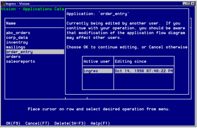 • If you select Edit for an application from the Applications Catalog window, Vision or ABF checks whether another user currently is editing the application.