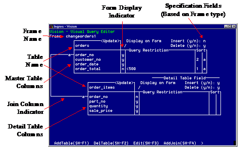 • The Master table and Detail table (if the frame has one) are represented as table fields in the visual query display. In each table field, one row corresponds to a column of the database table.