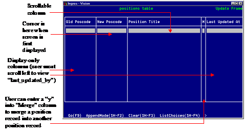 The following is the complete 4GL source code file for the Positions frame. The code for the frame's local procedures follows the basic frame processing code.
