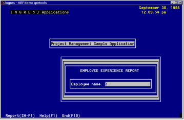 A report frame consists of a report and a menu for running it. The frame can include a form on which the user can enter one or more values used by the report at run time. You can create the form using the FormEdit operation to call VIFRED. In the following example, the user enters the employee name to request a report for that employee. The percent sign (%) is used to indicate all employees.