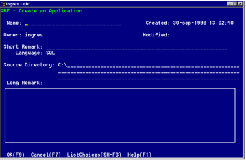 Default values occupy the following fields: the Owner (of the application), Language, Source Directory, and Created (date) fields. Because the Sales Entry Application is new, the other fields are empty.