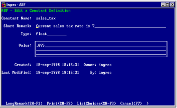 Once you create a constant, you can define and modify it by selecting the Edit menu item in the Edit Application Constants frame, shown in the Edit Application Constants frame figure. ABF calls the Edit a Constant Definition frame, shown in the following figure, for the constant you select.