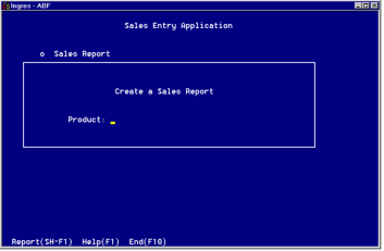 Topframe's Sales Report operation calls the Salerep pop-up frame. The following figure shows Topframe with Salerep displayed. The report presents data on the sales of a particular product. The parameter or variable that determines the content of the report is the name of a product. The user enters this in the Product field. The three Salerep operations displayed on the menu line allow a user to get help on the frame type, run the report, and return to the previous frame.