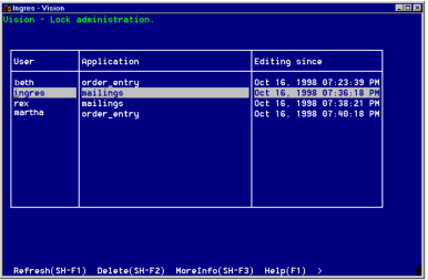 You can use the Refresh menu operation to redisplay the window in less than five minutes. In this way, you can use the Lock Administration utility to monitor the activity of Vision or ABF users in the database.