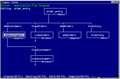 The following figure shows how the application flow diagram in the previous figure is redisplayed when you change the current frame from ViewOrders to its peer, AddCustomers: