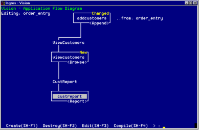 This figure shows what happens when you scroll down from "viewcustomers" to "custreport" as the current frame: