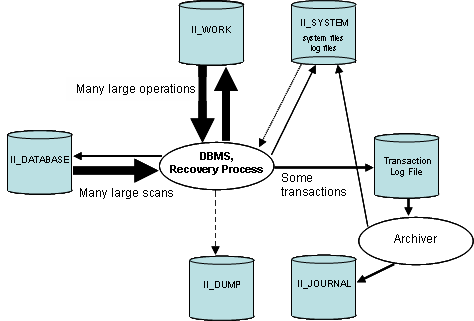 If your system queries and aggregates large volumes of data—as in a Decision Support System or Online Analytical Processing system—reading from the Data location occurs more in the form of partial and complete file scans. Manipulation of large data sets occurs in the Work location. Updating, and therefore logging, in such a system is typically minor.