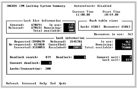 Fields displaying cumulative statistical data reflect activity from initial Ingres startup. This is the default mode when starting IPM. Current and Start time fields are not displayed.