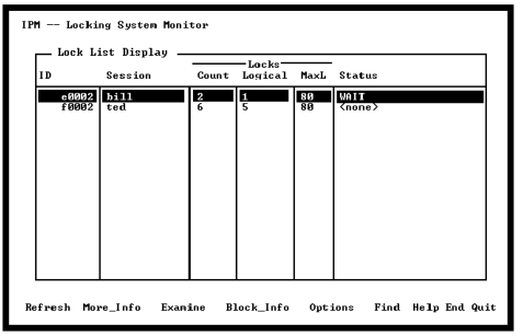 This screen displays all lock lists for current user transactions in the Ingres locking system on the current machine for the current installation. Lock lists that belong to user transactions also have an associated session name displayed.