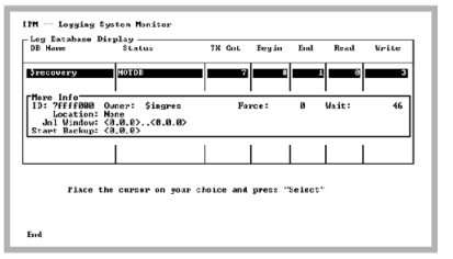 When the More_Info menu item is selected from the Log Database Display screen, a pop-up screen containing additional fields for the specified database is displayed.