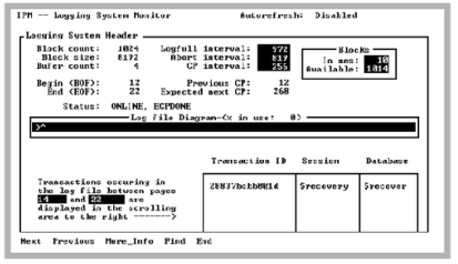 By using the Next and Previous menu items, you can move the caret symbol to any area of the Log file diagram covered by the arrow (“>----->”). By default, when the Examine menu item is selected, the caret symbol appears at the BOF. The Next menu item can be selected until a user transaction appears in the scrolling area. This transaction is the oldest transaction in the log file and prevents log file space from being reclaimed.