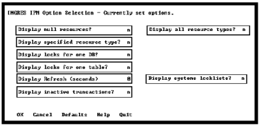 The Option Selection screen allows the runtime options to be viewed and changed while IPM is running. This screen can be selected from the Main Menu, Lock List Display, or Resource Display screens.