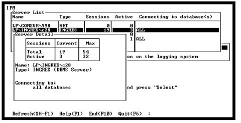 To display detailed information on a server, position the cursor at a server in the Server List and select More_Info from the Server List menu. The Server Detail pop-up is displayed. The boxed area shows the session count information.