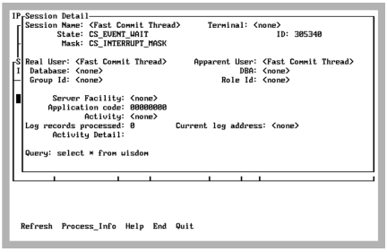 Session Name, Terminal, ID, Database, and Server Facility are the same as on the Session List screen. State is replaced by the expanded state and mask. The expanded state and mask expose details of the internal session state; those details are subject to change between Ingres releases and must be interpreted by qualified support personnel.