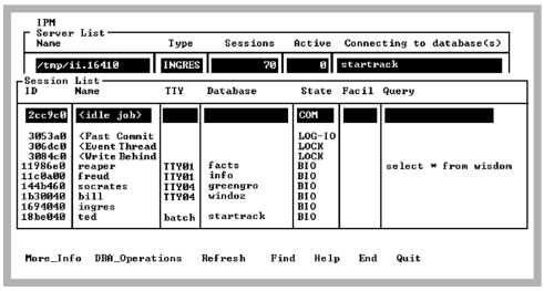 The More_Info screen shows more of the query. The query is shown only if it is current. A current query is one being processed by the Ingres DBMS Server, not a query that has returned results and finished executing, even though the user has not committed.
